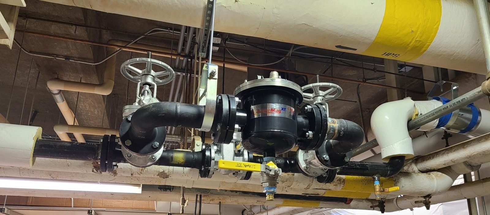A new massive 900 HP Steam Boiler was installed for a local Midwestern Hospital. Jaytech Water Solutions was pleased to provide their expertise on boiler protection after realizing that the piping and radiators were over 50 years old. The accumulating corrosion from the old pipes meant that even a new boiler could be immediately jeopardized without the proper protection. Jaytech recommended installing a BMXT/6 for the hot water condensing boiler system. After realizing the amount of contaminants that are filtered out of the hydronic system each time the unit is serviced, the installer now firmly believes that BoilerMag has their back.